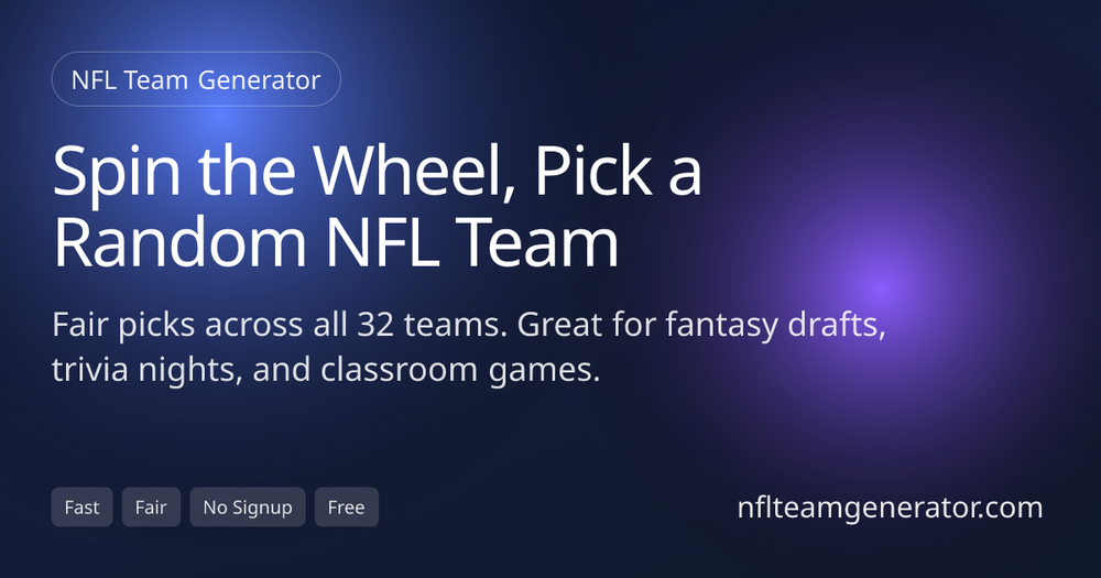 The NFL Team Generator is a free, online randomizer tool designed to instantly pick a random NFL team using an interactive spin wheel. This web-based application provides a fair and unbiased selection from all 32 official NFL teams, making it an ideal resource for a wide range of activities without requiring any signup or installation.